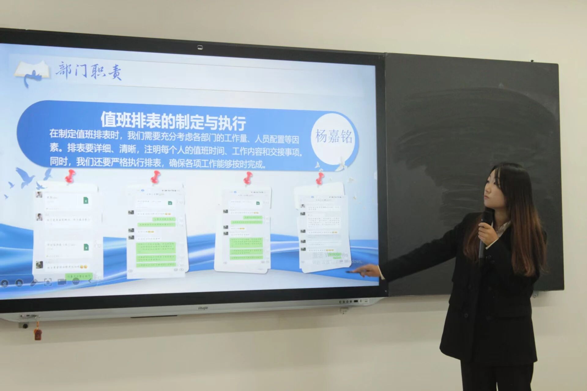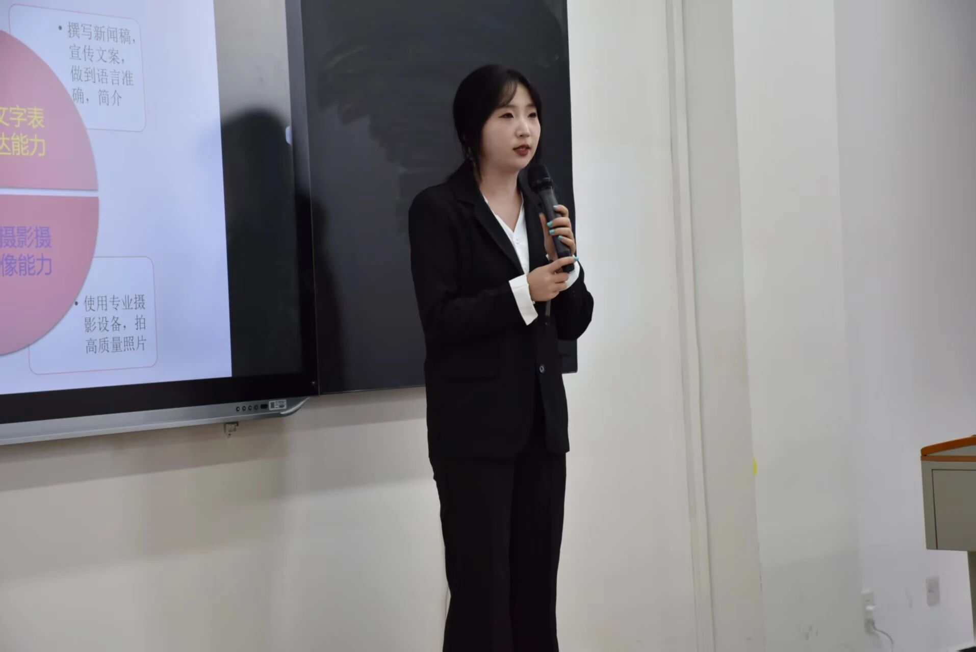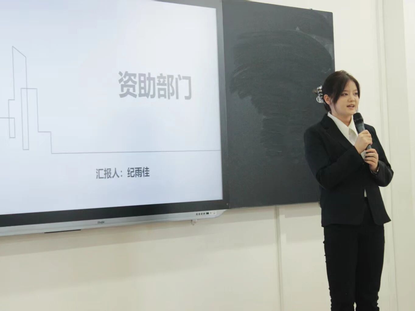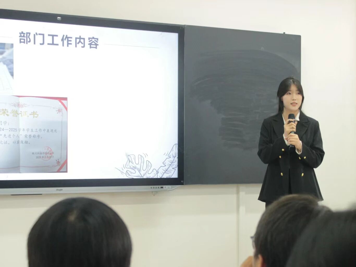活动伊始,各部门部长依次上台,结合图片与 PPT,生动介绍了本部门的工作内容与特色,展现了大学生事务中心多领域的风貌与精彩瞬间,并向新生力量致以诚挚的欢迎与美好祝愿。这些寄语不仅传递了对新干事的期待,也彰显了当代大学生的风采与担当。